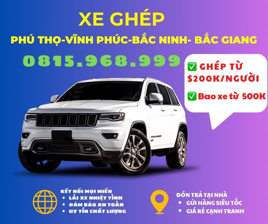 Chúng tôi chuyên cung cấp xe ghép , tiện chuyến , ký gửi đồ từ Bắc Ninh - Vĩnh Phúc - Phú Thọ và ngược lại .Ngoài ra chúng tôi còn cung cấp xe cho Du lịch , Đám cưới, Đám hỏi
